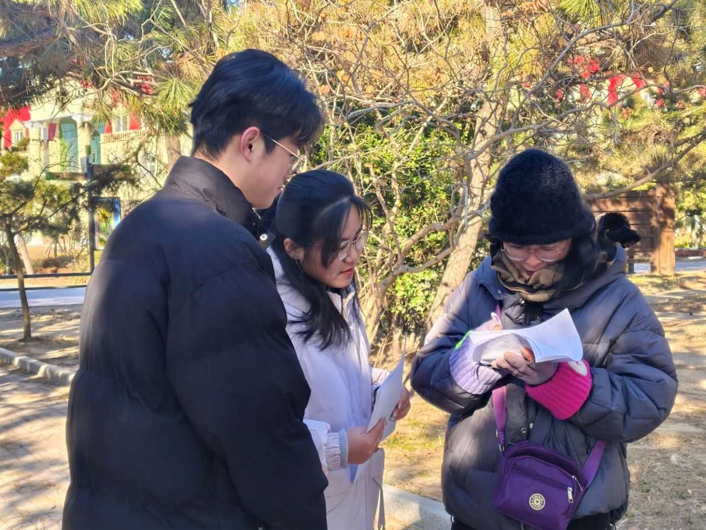 為了保障實地調研的數據的全面性和客觀性,提高實踐效率,“碳澤智行”社會實踐隊于2025年1月10日分別前往日照海濱國家森林公園和銀河公園開展實地考察。在調研過程中,隊員們以問卷調查的形式,從基本情況調查、土地利用變化情況、碳排放認知與感知、碳排放與土地利用關系這幾個方面對當地市民進行訪談。因此,實踐隊員們對當地的土地利用變化與碳排放有了初步的認識。