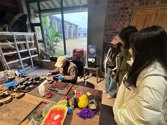 非遺文化的傳承與創(chuàng)新,離不開深厚的歷史底蘊。團隊首站選擇了桂林田心村藝術(shù)館漆藝龍才老師個展。跟隨著導(dǎo)游的步伐,團隊了解到桂林漆器的“前世今生”。作為一種具有獨特風(fēng)格和精湛工藝的中國傳統(tǒng)漆器,桂林漆器的歷史可以追溯到西漢初年。在明末便成為一種確定的藝術(shù)形式在嶺南地區(qū)流傳。“這個是靈芝漆杯,小巧、精雅,在清代后期頗受人們的追捧。”在導(dǎo)游細致的講解中,團隊成員增強了對桂林漆器的了解。