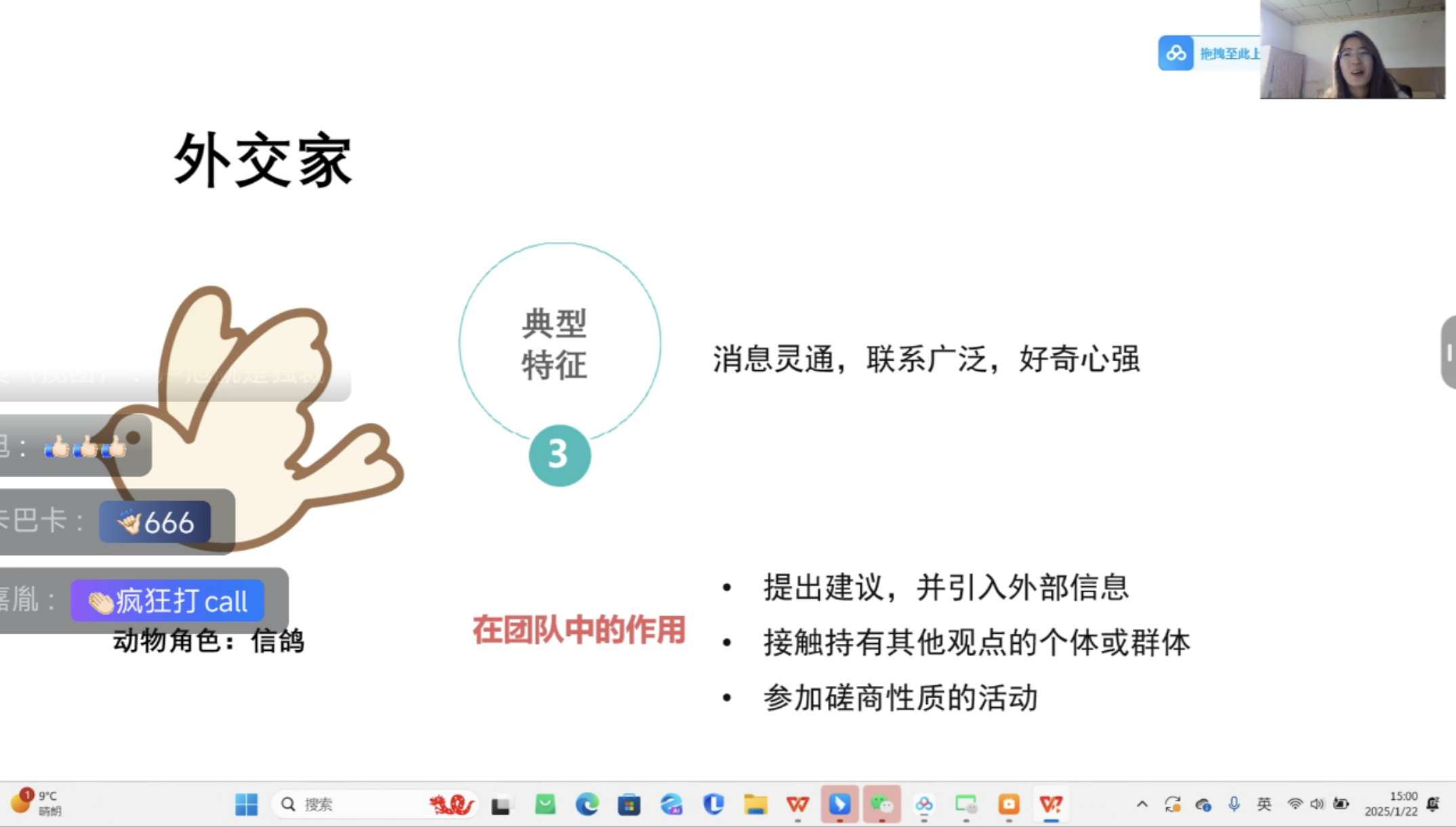 講師們各司其職,朱彥婧作為第一堂課的講師,通過線上教學,為學員們講解了團隊成員扮演的角色以及團隊合作的重要性。使學員們了解到團隊角色有智多星、氣氛組、外交家、實干家、質檢員、領航員,每個團隊角色都對應與其性格特征相符的動物角色令學員們更通俗易懂。在講課過程中,朱彥婧引用身邊事例描述團隊成員的重要所在,并拋出問題充分調動課堂氣氛,學員們積極回答問題。課后以小組形式對課程進行復盤總結,講師為小組成員復盤中出現的問題及時提供幫助。