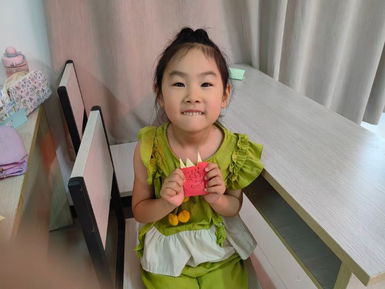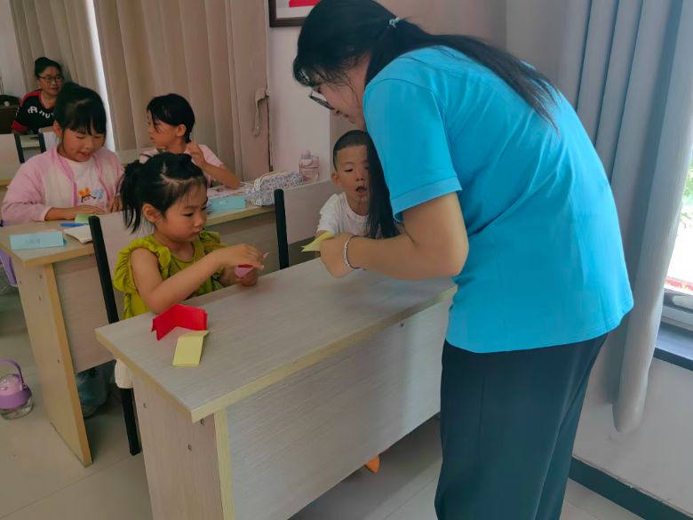 熱情的進行了自我介紹之后,緊接著的就是生動的手工課。孩子們對新老師充滿了期待。手工課是激發孩子們創造力和動手能力的絕佳契機。課前,手工課孟老師精心準備了豐富的手工材料,從五彩斑斕的彩紙、安全易用的剪刀、環保牢固的膠水,到富有特色的貼紙、輕巧的羽毛、閃閃發光的亮片等,為孩子們搭建起一個充滿可能性的創意世界。課堂開始,孟老師首先用幾個精美的千紙鶴成品吸引了孩子們的注意力。當一只只栩栩如生的千紙鶴展現在孩子們眼前時,教室里瞬間爆發出驚嘆聲和歡呼聲。孩子們的眼中閃爍著好奇與興奮的光芒,迫不及待地想要親手嘗試制作。隨后,孟老師詳細地講解了千紙鶴制作的步驟和技巧。她拿起彩紙,一邊示范如何折疊,一邊用簡潔明了的語言描述每一個動作要點。她的聲音溫柔而清晰,每一步都確保孩子們能夠看懂、理解并跟上節奏。在孩子們開始動手制作時,孟老師走下講臺,穿梭在各個小組之間,為了更好的提供指導和幫助,我們共同進入教學之中,大大加快了孩子們的學習速度。有的孩子對剪刀的使用還不夠熟練,彩紙剪得歪歪扭扭,我們就手把手地教他如何控制剪刀的方向和力度;有的孩子在組裝作品時遇到了困難,我們便和他一起分析問題,找出合適的解決方法,有些同學做的速度很快,我們鼓勵他發揮想象力做一些不一般的手工,雖然簡單卻充滿了童趣。