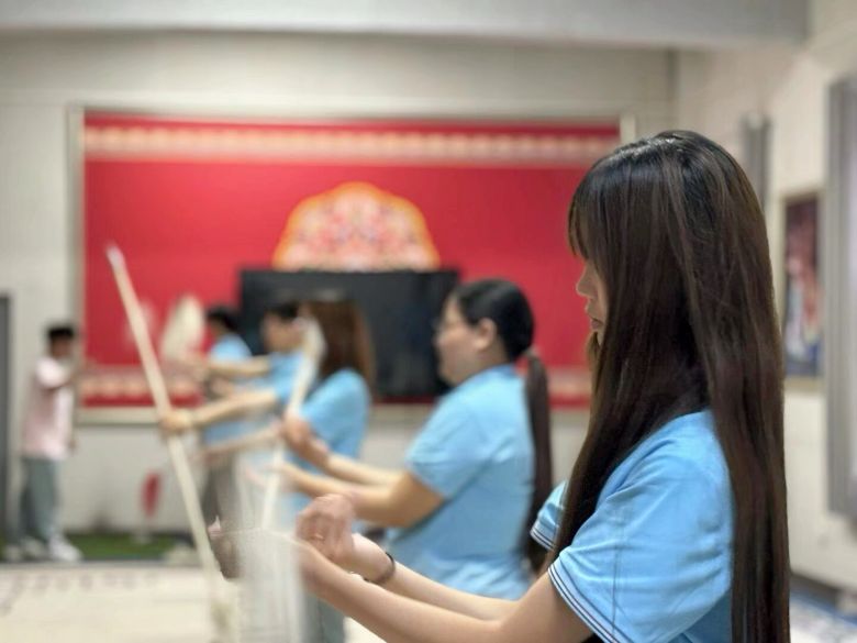 “披喉花要手腕發力,提槍花講究腰部旋轉帶動”,在排練室里,同學們正在專業武生演員指導下練習把子功,手持道具刀槍,從基本的丁字步站姿到動作拆解,逐一把“披喉”“提槍”等經典程式動作練得有模有樣。