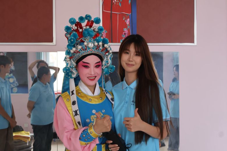 調研團有幸觀摩了青年演員袁小月老師展示的劇目《誰說女子不如男》。從大家閨秀到云龍黃袍,袁老師為我們詳細講解了豫劇服裝所對應的不同人物。結束后我們與身著戲服的袁老師合影留念,近距離看名家扮相,才懂得戲曲化妝里“紅妝不掩英雄氣”的深意。