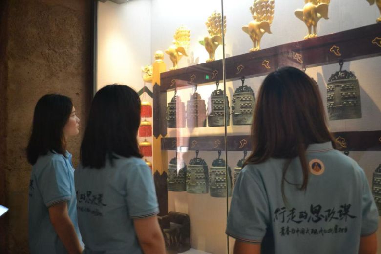 “余音繞梁,三日不絕。”調研團隊在博物館的文物展廳被一套古老的編鐘深深吸引。講解員介紹,這是按照曾侯乙編鐘樣式精心復刻的展品,其音色純正、音域寬廣,音色清脆悠揚,似有魔力般能穿越時空,是中國古代音樂文化的瑰寶。我們站在展柜前凝視著在燈光下熠熠生輝的金色編鐘,感受著古人對音樂的執著追求和精湛技藝。通過這次觀摩,我們深刻理解了豫劇音樂與傳統音樂文化的深厚淵源,體會到音樂作為文化紐帶的永恒魅力。
