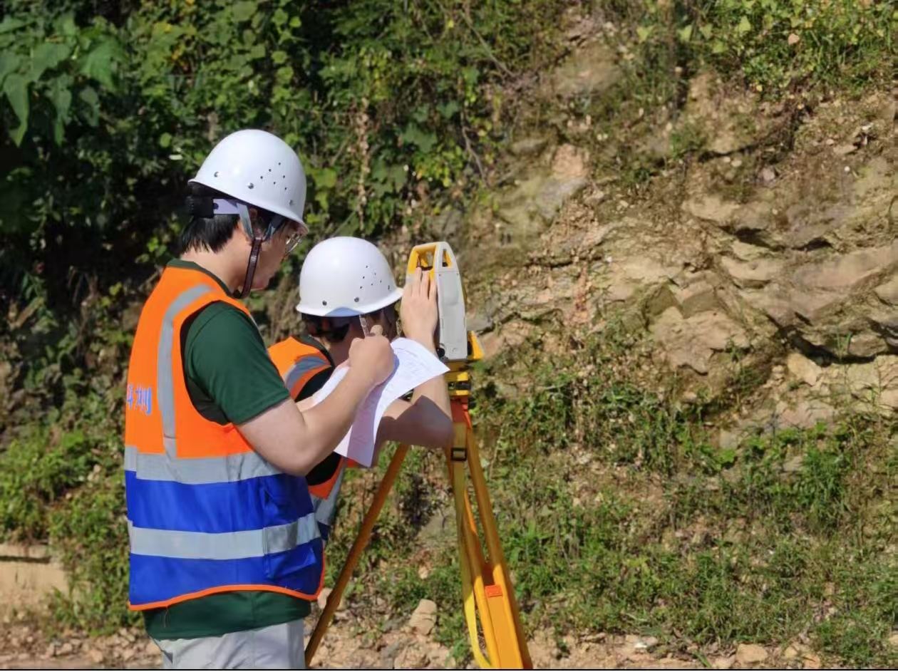 圖1研究生服務團隊合影抵達爐竹村后,團隊迅速投入緊張有序的工作。他們攜帶了地質探測儀、無人機、全站儀、測距儀等一系列先進專業設備,這些裝備如同他們的“秘密武器”,為精準探測地質隱患提供了有力支撐。在帶隊導師的現場指揮下,團隊成員有條不紊地對當地的滑坡區域展開細致勘查,仔細分析邊坡巖體的傾向與傾角,不放過任何一個可能影響邊坡穩定性的細節;利用皮尺,認真丈量邊坡的高度、長度等關鍵數據,為后續的分析提供基礎依據;操作全站儀對邊坡進行三維坐標測量,通過高精度的測繪數據構建出邊坡的精確形態模型,從而對邊坡穩定性進行科學評估,并運用專業軟件對拍攝數據進行深入分析,進一步挖掘潛在的地質隱患。