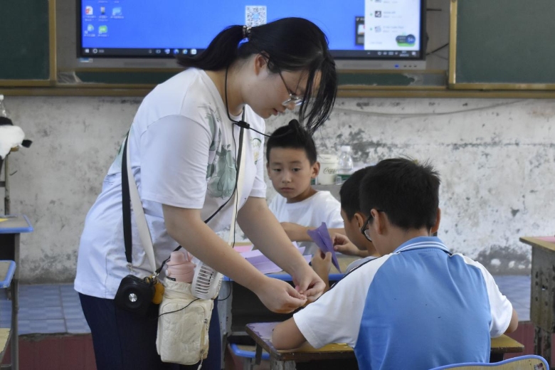 見面會上,支教組的成員們依次介紹了自己的姓名、來歷以及此次支教的主要目的,讓同學們對老師和接下來的課程有了初步的了解。在建立起初步的信任后,支教組老師帶領大家開展了名為“破冰行動”的互動環節。每位同學都分到了幾張彩紙,在老師的指導下,將這些彩紙折疊成飛機和簡易的“飛機發射器”。當所有同學都完成作品后,大家一同來到室外,在老師的帶領下,親手放飛了自己制作的紙飛機。