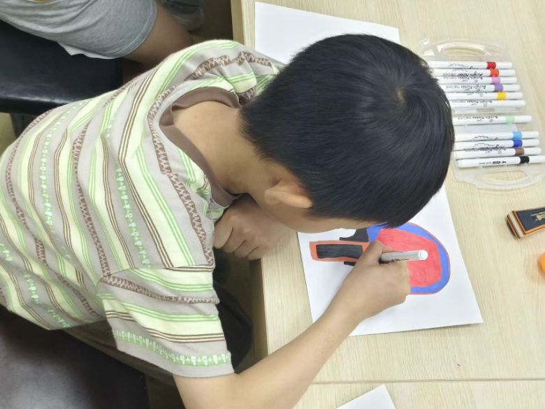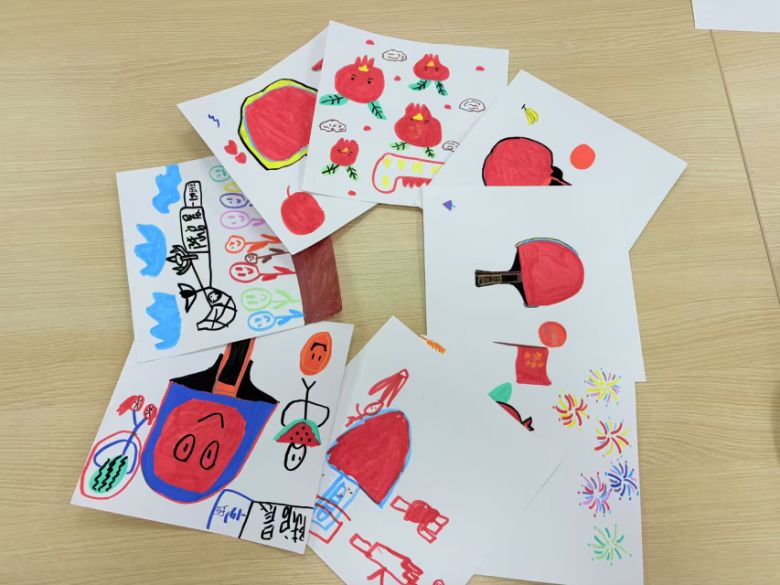 活動當天,社區活動中心被布置成充滿活力的“乒乓藝術角”。實踐團成員耿欣悅以一段精彩的國球歷史動畫短片開場,生動講述乒乓球從起源到成為“國球”的歷程,展示中國運動員在國際賽場上的拼搏瞬間,點燃孩子們的創作熱情。繪畫環節中,孩子們手持彩筆與畫紙,充分發揮奇思妙想:有的將球拍繪制成宇宙飛船,乒乓球化作穿梭星際的衛星;有的描繪社區乒乓球臺旁熱鬧的運動場景,球拍上點綴著鮮艷的花朵;還有孩子用夸張的線條表現乒乓球旋轉的動感軌跡。實踐團成員全程陪伴指導,耐心糾正握筆姿勢,與孩子們探討色彩搭配和構圖技巧。經過近半小時的創作,十余幅充滿童趣與創意的作品鋪滿展板,現場洋溢著歡樂與自豪的氛圍。