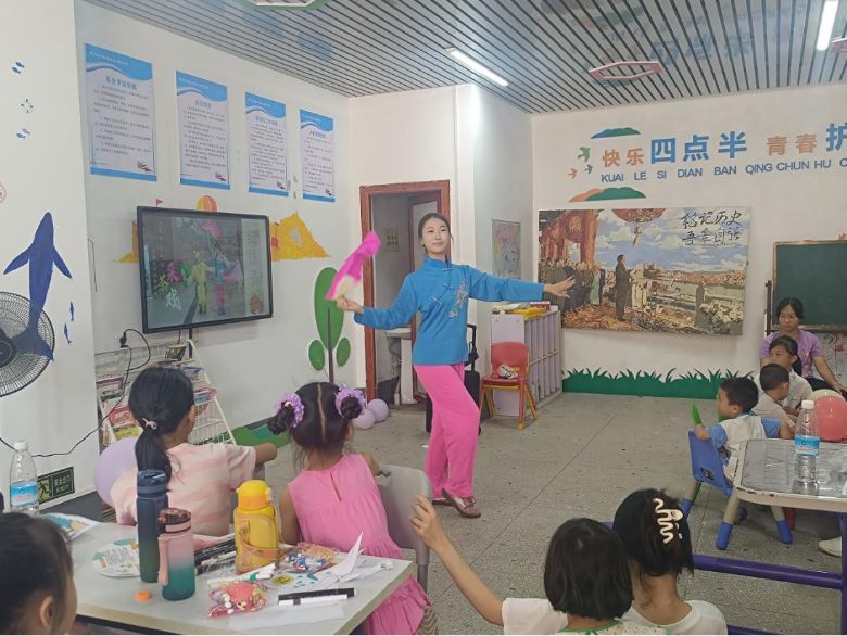 參觀完整訓(xùn)舊址后,志愿者們馬不停蹄的奔赴下一場(chǎng)活動(dòng)——一場(chǎng)別開(kāi)生面的贛南采茶戲小課堂。在上堡鄉(xiāng)新時(shí)代文明實(shí)踐所,實(shí)踐隊(duì)員化身“非遺小講師”,用生動(dòng)教學(xué)讓孩子們沉浸式感受贛南采茶戲的獨(dú)特魅力。課堂上,隊(duì)員手持鮮艷的采茶戲扇子,從基本扇法教起,“平扇”“翻扇”“繞扇” ,一個(gè)個(gè)動(dòng)作分解演示,孩子們圍坐桌邊,眼神里滿是好奇與專注,跟著節(jié)奏認(rèn)真模仿。講解完成后,隊(duì)員還帶領(lǐng)小朋友去感受、模仿,深刻體會(huì)采茶戲的藝術(shù)魅力。在課堂結(jié)束后,志愿服務(wù)隊(duì)與小朋友們合影留念。