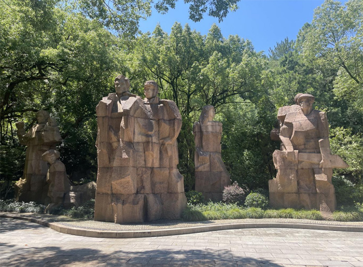 在紀念碑對面的,是一組栩栩如生的烈士雕像群。有的昂首挺立,目光如炬穿透時光,仿佛仍在眺望著為之奮斗的遠方;有的緊握武器,蓄勢待發,每一個筋肉輪廓都凝固著瞬間的決絕力量;其中一位指揮員高舉的手臂,定格在半空,那伸出的方向,仿佛就是光明與理想的所在。他們的臉龐剛毅而年輕,我走近細看,甚至能感受到石雕衣袂的褶皺間透出的風霜與硝煙氣息。輕輕觸摸那冰冷堅實的巖石表面,指尖傳來的卻是一種灼熱的溫度,仿佛烈士們澎湃不息的熱血仍在其中流淌。