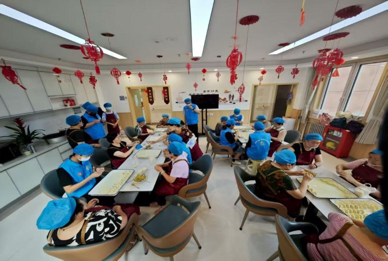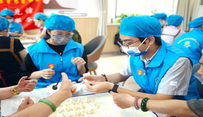 上午10點,廚房飄來面粉的清香。志愿者們圍在長桌旁,開始為老人們準備餃子宴。有經驗的志愿者當起了 “老師”,手把手教大家捏餃子的技巧:“這里要捏緊,褶子這樣翻過來,才好看又不漏餡。” 隊員們學得認真,雖然速度趕不上熟練的志愿者,但每個人都專注地忙碌著。