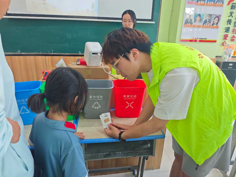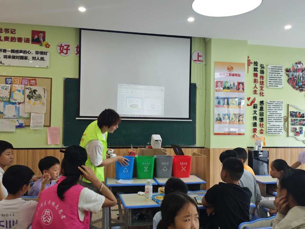 作業輔導結束后,以“垃圾分類,從我做起”為主題的文明生活教育活動正式啟動。團隊成員通過概念講解、圖片展示與視頻教學等形式,引導學生系統了解垃圾分類知識,使其掌握正確分類方法并樹立自主的文明意識。為提升學生參與積極性,團隊設置了游戲環節,并以小禮物作為激勵,現場氣氛迅速活躍起來——學生們踴躍舉手搶答,甚至有小朋友興奮地站在凳子上高舉手臂示意,積極展示所學文明知識。通過互動實踐,學生們不僅深化了對環保文明的理解,更切實提升了日常生活垃圾分類能力。