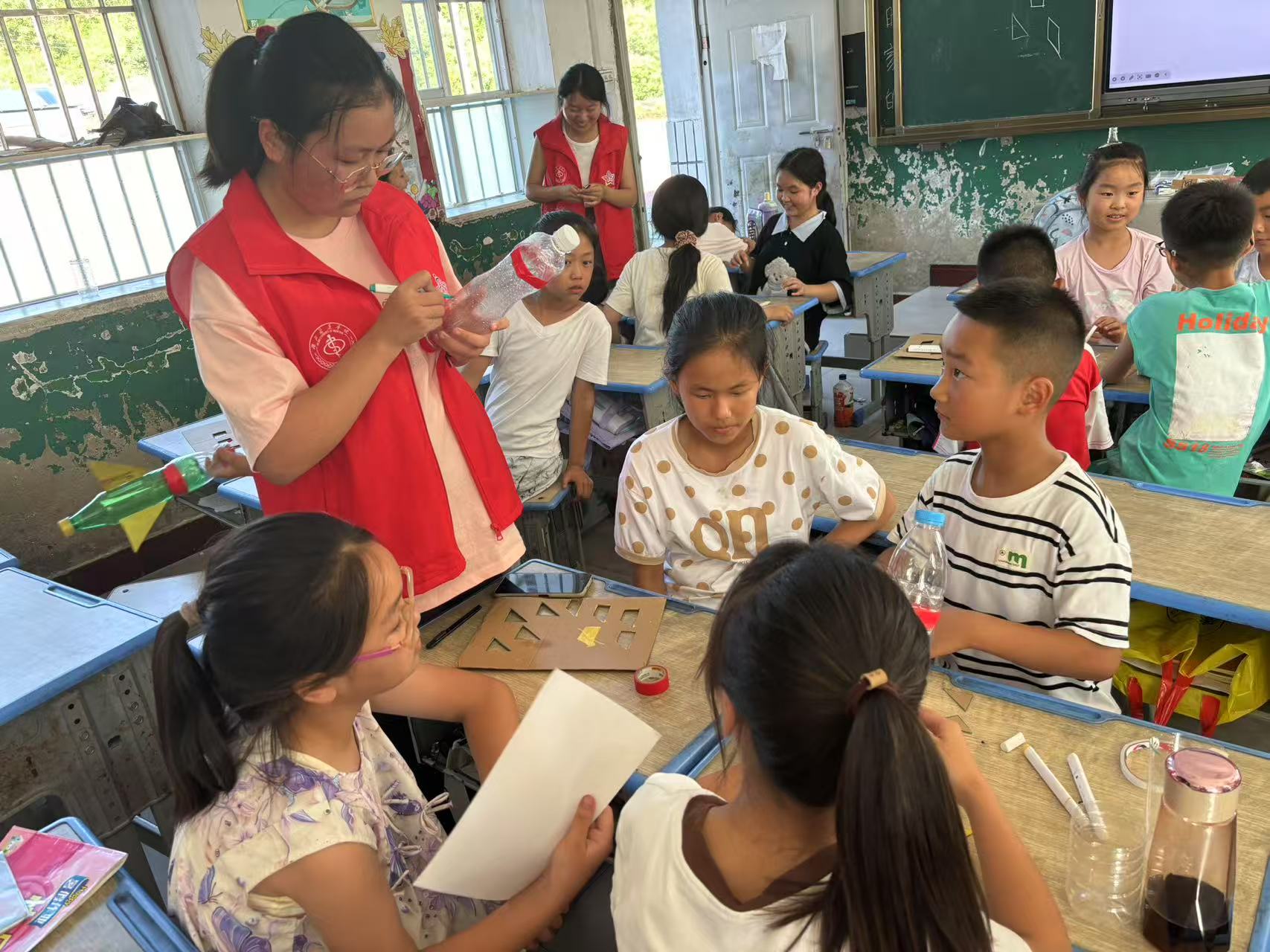 在丁家營鎮小學,實踐隊創新打造 "理論+實踐" 雙課堂模式。理論課堂上,隊員們通過元勛事跡講解、紅歌傳唱、經典誦讀等形式,生動講述錢學森、鄧稼先等科學家的感人故事;實踐課堂則設置了衛星模型制作、水火箭實驗、航天拼圖等互動項目,讓孩子們在動手實踐中感悟科學精神。在社區宣講中,實踐隊深入人員聚集中心、鄉鎮廣場等地,通過主題宣講、問答交流會等形式,讓"兩彈一星"精神走進基層。在南水北調工程紀念館,隊員們結合丹江口本地特色,講述了丹江口大壩作為大國重器與“兩彈一星”有著異曲同工之妙,引發社區居民強烈共鳴。