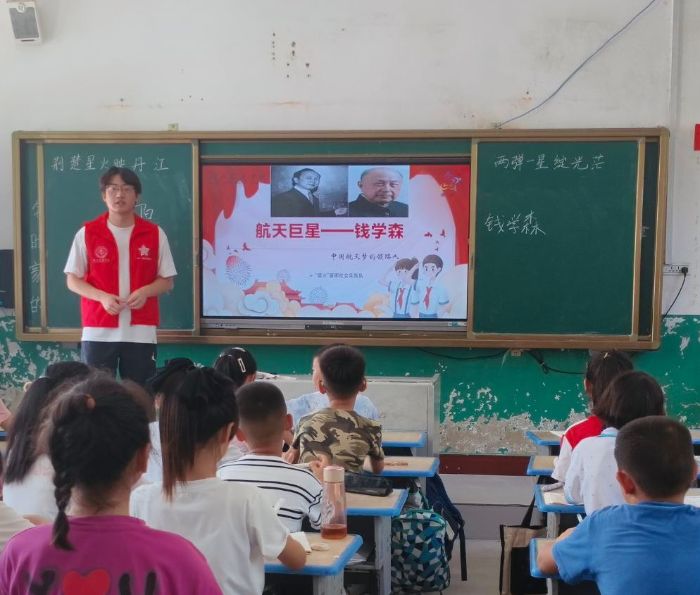 活動期間,“星火”實踐隊圍繞“兩彈一星”這一核心主題,設計了豐富多元的內容。在知識課堂上,隊員們用通俗易懂的語言,結合圖片、短視頻等素材,向孩子們講述了“兩彈一星”的研制歷程、重大意義,以及背后鮮為人知的艱辛故事,讓孩子們了解到我國在國防科技領域從無到有、攻堅克難的輝煌成就。為了讓“兩彈一星”精神更具象化,隊員們重點介紹了錢學森、鄧稼先、郭永懷等功勛人物的事跡:錢學森放棄國外優渥條件毅然回國,鄧稼先隱姓埋名數十年投身核試驗,郭永懷在飛機失事時用身體保護科研資料……這些感人至深的故事,讓孩子們深刻感受到老一輩科學家“熱愛祖國、無私奉獻、自力更生、艱苦奮斗、大力協同、勇于登攀”的精神內核,不少孩子在聽完后主動表示“要向科學家爺爺學習”。