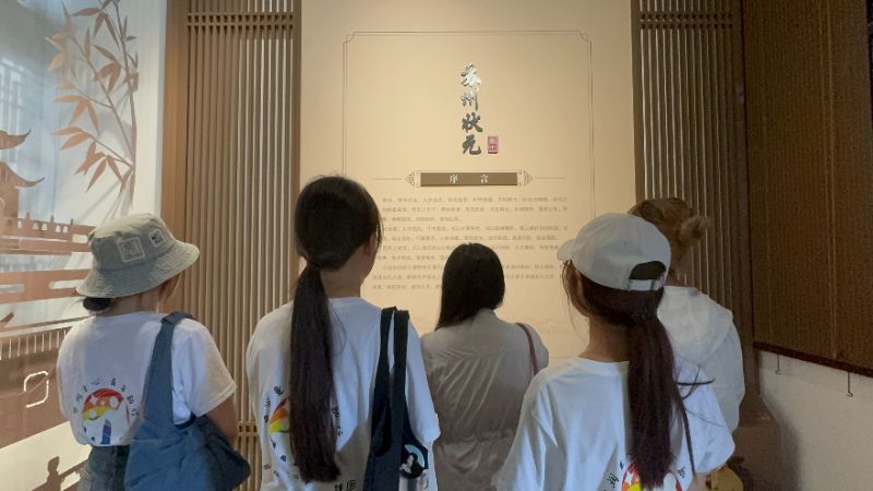 團隊隨后走訪蘇州狀元博物館。入口處,祁子涵同學為大家詳細講解狀元博物館的基本情況,吸引游客駐足傾聽。進入博物館,實踐團成員們被一幅幅狀元畫像和一件件珍貴文物所吸引。在清代狀元潘世恩的展區,他的殿試答卷字跡工整、論述精辟,展現出深厚的學識功底。