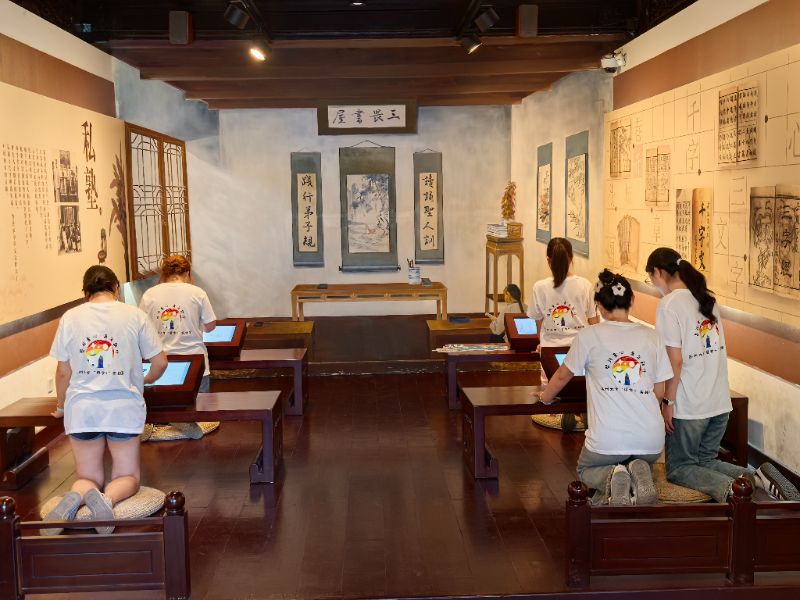 團隊成員于館內私塾室共讀詩詞作品,與范仲淹等歷史人物跨時空對話;借助現代科技,以知識闖關、學寫毛筆字的方式學習蘇州優秀傳統文化。文物陳列展前,團隊成員通過知識問答的方式加深對文物歷史的了解,成一涵帶領大家齊頌《蘇州教育賦》,誦讀聲朗朗,團隊成員對蘇州教育文脈的理解更加深入。
