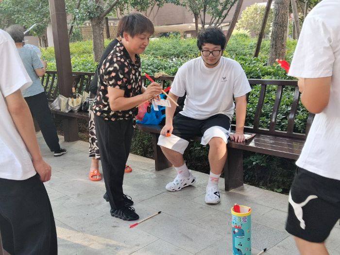 投壺區(qū),老人們紛紛彎腰投壺,體驗(yàn)傳統(tǒng)游戲的樂趣。即便有些老人們動(dòng)作生疏,依然樂在其中。