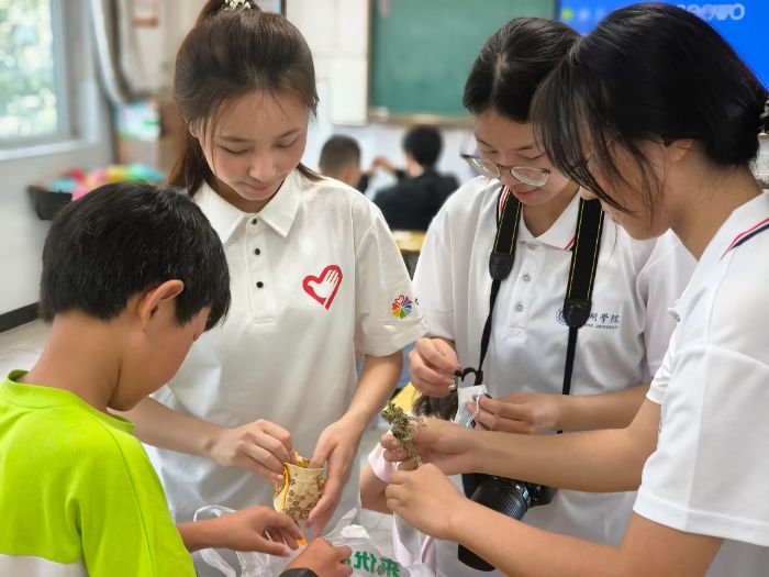 最后,實踐團的成員以寓教于樂的方式,帶領小朋友們沉浸式體驗中醫藥文化魅力。成員們耐心指導孩子們完成中醫藥草拼圖并制作艾草香囊,讓傳統中醫藥文化在一針一線間傳承延續。