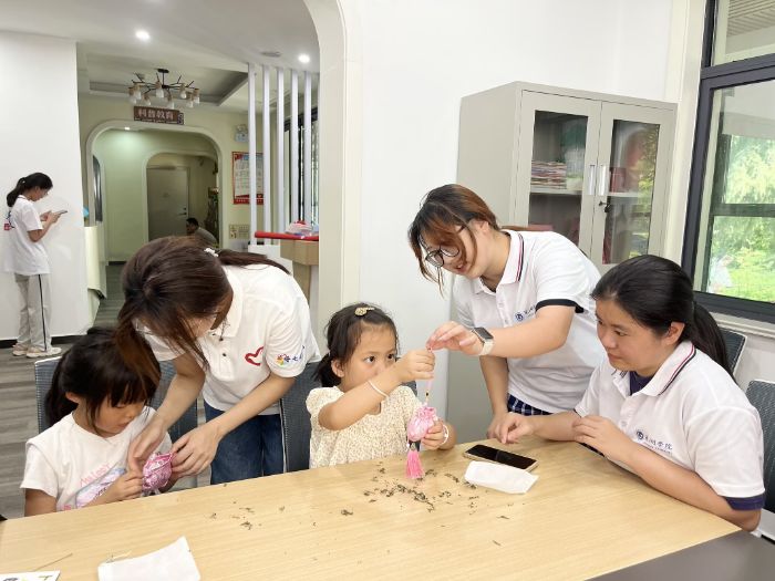 最后,團隊成員化身“小導師”,指導小朋友們通過趣味拼圖的方式觀察藥材形態、學習藥用價值,進一步鞏固中醫藥知識,并分組帶領小朋友們手工香囊制作,從選料、縫制到填充全程耐心指導。小朋友們捧著親手制作的香囊,與團隊成員合影留念,歡聲笑語中,中醫藥文化“可觸可聞”的獨特魅力得以生動展現,在孩子們心中種下了傳承中醫藥文化的種子。