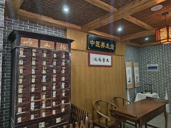 隨后,成員們分散開來自由探索。在“醫學成就”展區,木質框架搭配白底黑字,詳實記錄著峏山楊在婦科調理、疑難雜癥診治等方面的醫術傳承與創新路徑,墻上列出的相關著作,是學術沉淀的展現;古舊的峏山楊藥柜前,密密麻麻的小抽屜里,藏著數不盡的中醫藥智慧,一旁“中醫養生堂”區域,古色古香的桌椅、“大醫精誠”牌匾,還原出歷史長河另一邊,中醫們問診時的溫馨場景。展區中有兩面磚墻格外打眼,紅彤彤的錦旗懸掛墻上,“醫術精湛,送子觀音”的燙金大字,是患者康復后真摯的感恩,它們不只是冰冷的文字,更是無聲彰顯著峏山楊醫者仁心的榮耀。行至“展望未來”板塊,成員們了解到峏山楊醫術已列入“非遺”保護名錄,并且有著自己的傳承與創新計劃。