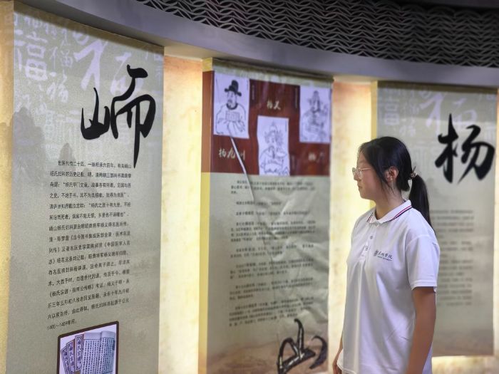 初覽底蘊,細探傳承。團隊成員有序步入峏山楊中醫展館,開啟探尋起源之旅。推開古樸的木質大門,踏入展館的那一刻,一組獨特的墻面展示率先映入眼簾,灰底黑字的板塊錯落排布,金色“峏山楊”標識醒目突出,下方“婦科圣手”四字,凝練著其在婦科領域積淀的深厚底蘊。成員們紛紛湊近細觀,只見其上記載著峏山楊發源于巢湖柘皋峏山大楊村,其作為中醫婦科醫學世家,自明初傳承至今已近六百年,醫學分支廣布江淮大地,在歲月流轉中持續傳遞著中醫溫度 。