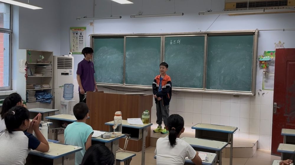 隨后,為了讓孩子們與實踐團成員更加熟悉,團隊組織了一系列的互動游戲,如“數字接力”和“快問快答”。孩子們在輕松愉快的氛圍中,不僅享受了游戲的樂趣,也在無形中學習到了團隊合作和知識探索的重要性。游戲結束,孩子們迅速與班級同學熟絡起來,積極地與實踐團成員分享自己的看法和想法,現場氣氛熱烈,孩子們與實踐團成員彼此初步建立了友誼。