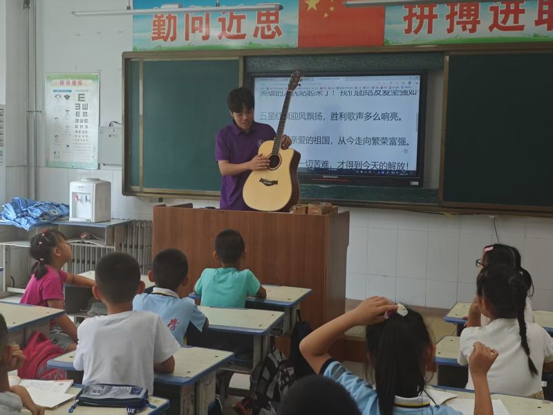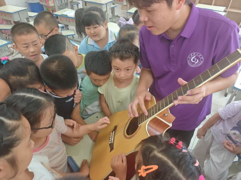 除了教唱紅色歌曲外,實踐團成員王興諾還以吉他為教具,為小朋友們介紹吉他相關知識,為紅色音樂課的進行提供樂理知識支撐。小朋友們認真地聆聽講解,并通過親身體驗感受,極大地激發了孩子們對紅色歌曲的興趣,同時潛移默化地加深同學們對革命精神的理解。
