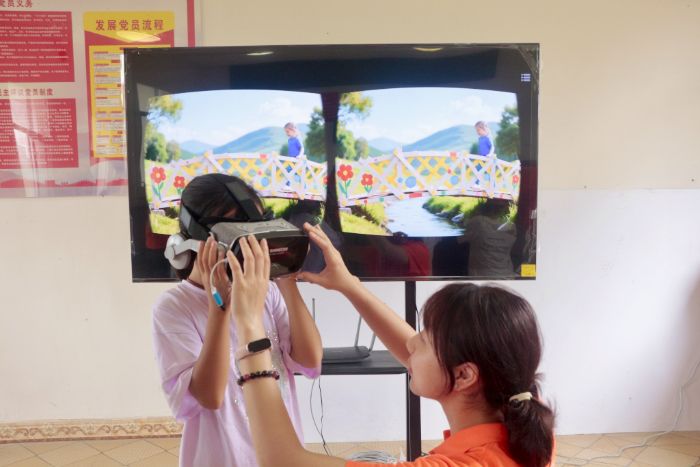 為了點燃孩子們心中更大的工程夢想,服務隊巧妙地運用科技讓冠軍組紙橋“走出”課堂。首先利用AI圖像生成工具,輸入冠軍組紙橋的關鍵結構特征和鄉村常見場景關鍵詞。冠軍組紙橋瞬間“化身”為溪流上的竹木小橋、連接田埂的堅實便橋。接著,服務隊將生成的圖片導入VR眼鏡里,當孩子們戴上VR眼鏡,他們看到小朋友腳下踩著的正是以他們冠軍紙橋為原型“建造”的鄉村小橋,他們可以“走”上橋面,低頭觀察橋下熟悉的加固結構如何支撐行人。這一刻,抽象的工程原理變成了可觸摸的家鄉未來圖景。