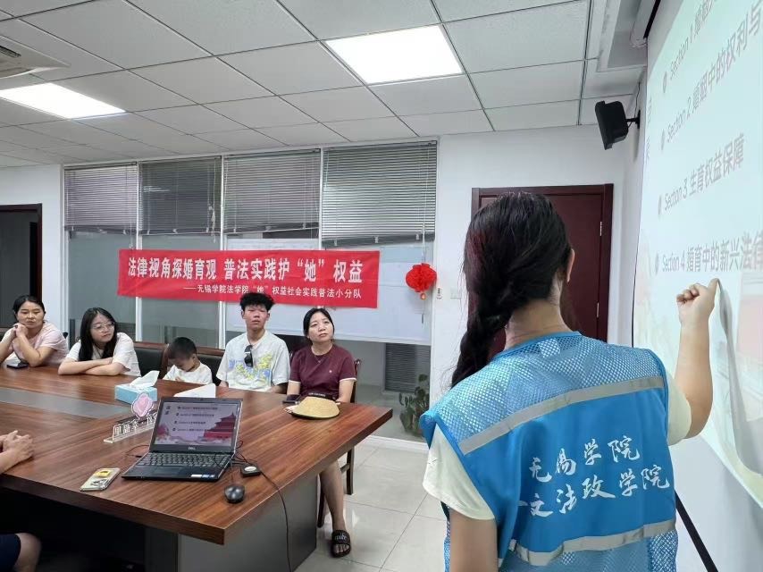 青年自身需知曉法律對婚姻生育的保護,學會維護自己的合法權利,青年女性亟需補上法律意識課,清晰了解勞動權益保障與婚姻家庭中的權利義務,掌握維權路徑,比如,遭遇家暴時應立即報警取證,財產分割前注重證據留存等。團隊也深入基層社區進行普法活動。7月9日,在蘇州市國香園社區普法課堂上,主講人賴思希結合真實案例解析《民法典》關于婚姻撤銷、彩禮返還、夫妻共同財產認定的條款,為青年筑起一道理性的防護網。