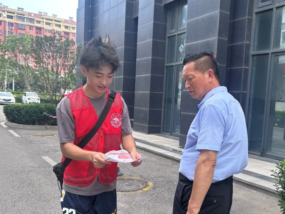當日,鞍山路社區的街頭、樓宇間,活躍著團隊成員們的身影。大家身穿印有“山海博時急救宣傳團”標識的紅色馬甲,手持精心準備的宣傳單,主動走近居民。