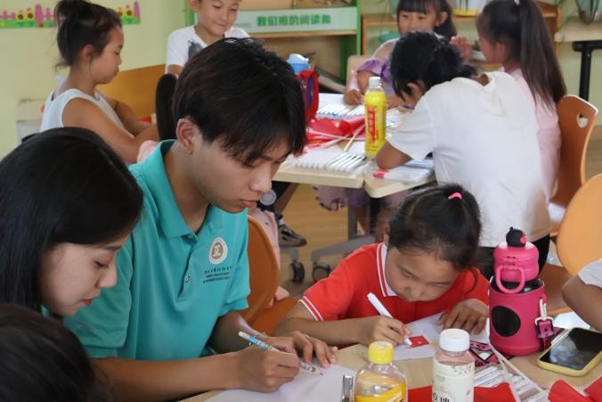在推廣語言文化、傳承紅色精神的同時,阜益同行實踐團深刻認識到美育啟蒙與學業幫扶對鄉村兒童全面發展的重要性。為此,團隊精心設計并開展了“七彩課堂”與“學業啟航”幫扶志愿行動,為馬蘭小學的學生搭建起全面發展的橋梁。實踐團成員在“七彩課堂”中組織學生開展繪畫活動,以色彩進行表達,傳遞孩子們對祖國的熱愛。在“學業啟航”行動中,隊員們為學生進行語文作業輔導,解決發音誤區,并針對知識薄弱點進行講解。“七彩課堂”與“學業啟航”雙軌并行,將藝術熏陶與知識傳遞緊密結合,成為本次實踐團助力鄉村教育振興、用愛心與智慧“潤澤童心”的溫暖實踐。