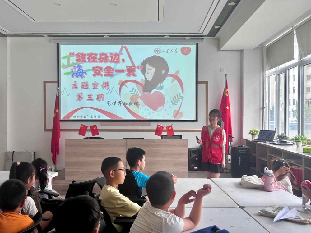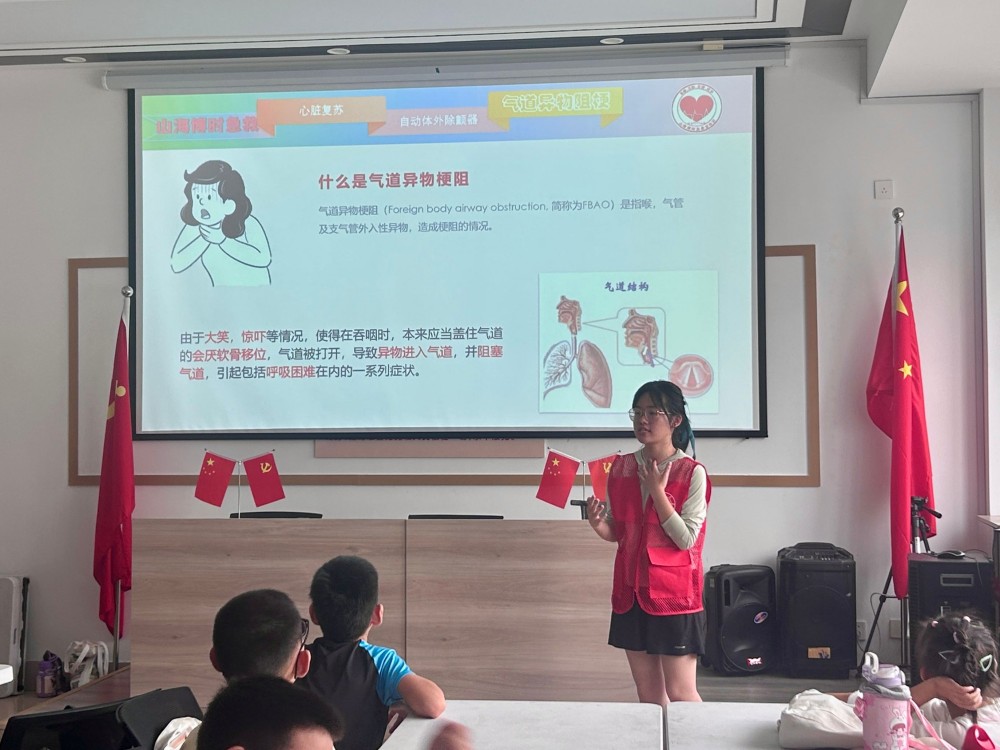 7月24日上午,威海市環(huán)翠區(qū)怡園街道濱州街社區(qū)的活動(dòng)室里熱鬧非凡,30余名小學(xué)生齊聚一堂,參加“救在身邊,安全一夏”主題宣講第三期活動(dòng)。山東大學(xué)“博時(shí)急救”宣傳團(tuán)的志愿者們,帶著生動(dòng)的教具和趣味互動(dòng),為孩子們普及海姆立克急救法,教大家應(yīng)對(duì)氣道異物梗阻這一夏季常見(jiàn)意外。