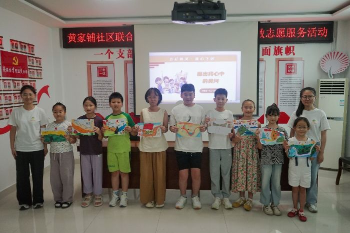 筆繪山河,合影存初心。科普結束后,“繪出心中黃河”活動隨即展開。同學們化身小畫家,用色彩與線條表達對黃河的想象:有的畫下黃河在陽光下波光粼粼的模樣,有的畫出岸邊生機勃勃的草木,還有的將黃河與城市景象結合,充滿童趣與創意。畫作完成后,大家舉著作品并肩合影,畫面里,稚嫩的畫作與燦爛的笑容交相輝映,成為對黃河之愛最直觀的表達。