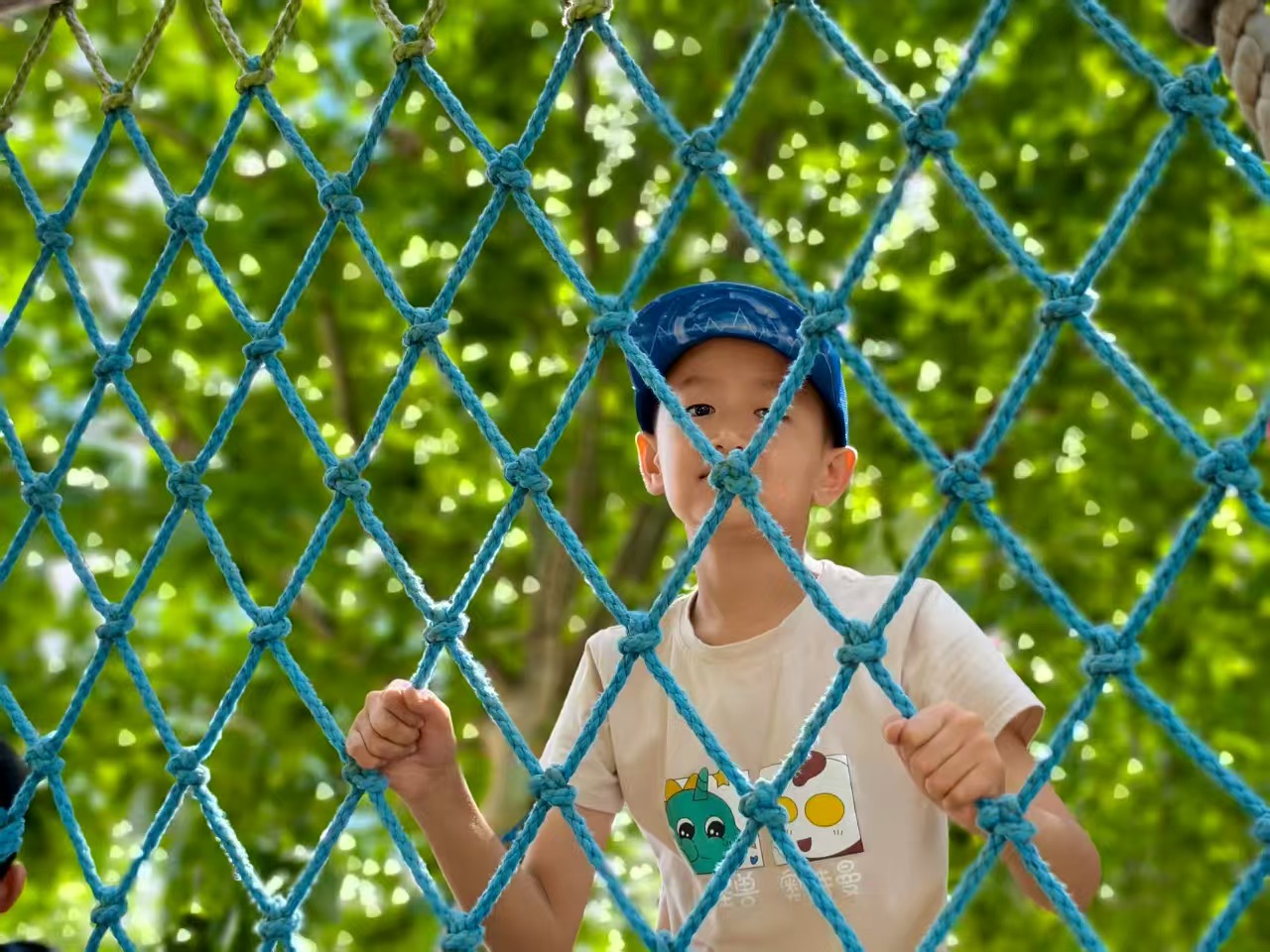 上午,同學們分為兩隊,在黑叔的指導下展開了“撒野大闖關”六關挑戰。匍匐越障時,大家在沙地上奮勇爭先,膝蓋抵著沙粒,身體緊貼地面,卻把困難變成了歡樂的游戲;攀樹鳴金環節,每向上一步都離不開手腳并用,老師的托舉與同伴的鼓勵化作自信的搖鈴聲,滿載著驕傲;輪胎接力中,沉重的輪胎和漫長的賽道沒能阻擋前進的腳步,隊友的期盼眼神與吶喊讓頑強的腳步愈發輕快;懸輪競速考驗著力量與耐心,孩子們全神貫注的純粹比速度更顯珍貴;鉆桶競速像一場童年探險,在黑暗中堅持前行,終會遇見光明;箭術爭勝時,孩子們化身小小弓箭手,“9環!10環!”的吶喊聲中,藏著被擊中的童年夢想。