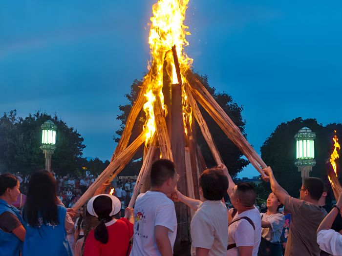 火把節(jié)是彝族、白族等民族的傳統(tǒng)節(jié)日,被稱為“東方的狂歡節(jié)”。7月18日晚,廣場空地上,穿繡花圍裙的彝族鄉(xiāng)親、戴銀飾的本地老師,還有其他團(tuán)隊的志愿者圍起圈子,跟著蘆笙節(jié)奏邁著“踩三碾一”的步法。實踐團(tuán)成員們也加入其中,經(jīng)過幾輪嘗試,團(tuán)隊成員的腳步從磕絆變得平穩(wěn)。幾位志愿者代表上前與當(dāng)?shù)厝嗣窆餐c燃主火把,火苗“轟”地燃起,躥起半人高。歡呼聲里,團(tuán)隊成員與阿婆、本地老師、其他志愿者手牽得愈發(fā)的緊,笑聲混著火苗的噼啪聲,在夜色里越蕩越遠(yuǎn)。