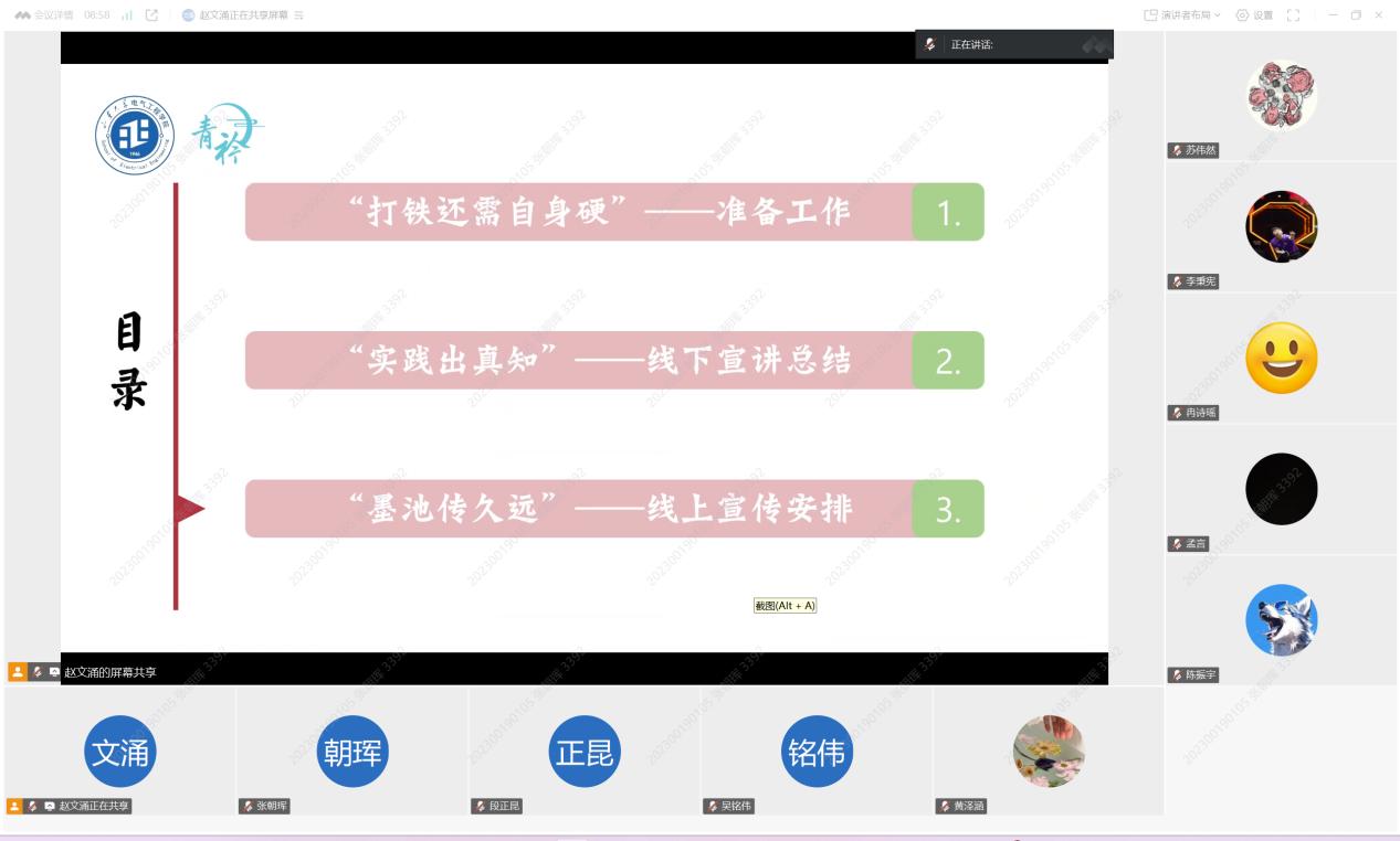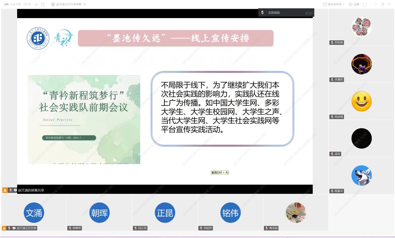 會議中,為了繼續擴大本次社會實踐的影響力,趙文涌還指出下一步線上宣講安排,為后期團隊宣傳指明方向,如中國大學生網、多彩大學生、大學生校園網、大學生之聲當代大學生網、大學生社會實踐網等平臺宣傳實踐活動。