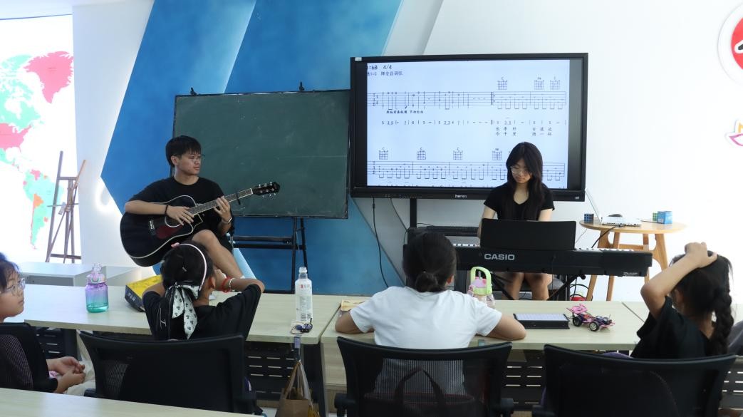 課堂的尾聲,老師精心安排了一場小型樂器演奏會。兩位擅長樂器的老師分別帶來了吉他彈唱和鋼琴獨奏。當吉他清澈而富有節奏感的音符流淌出來時,孩子們睜大了好奇的眼睛,隨著旋律輕輕搖擺;而當優雅流暢的鋼琴聲響起,如月光般灑滿整個活動室,孩子們瞬間安靜下來,沉浸在美妙的音樂世界里。演奏者不僅展示了精湛的技藝,更用音樂講述著故事,傳遞著情感。孩子們近距離地感受著不同樂器的獨特魅力,眼中閃爍著對音樂藝術純粹的向往和驚嘆。兩位老師還簡單介紹了樂器的基本知識,鼓勵有興趣的孩子未來可以嘗試學習。這短暫的視聽盛宴,為孩子們揭開了樂器演奏的神秘面紗,在他們心中種下了探索更廣闊藝術世界的種子。