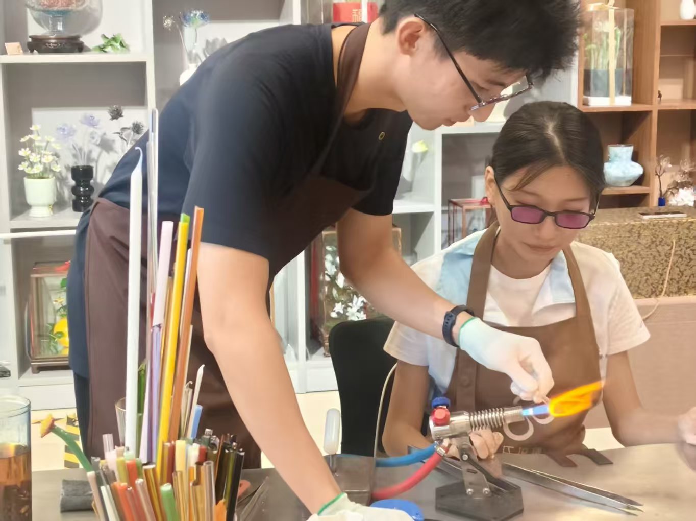 隨后,實(shí)踐隊(duì)參與琉璃小掛件制作體驗(yàn)。在匠人指導(dǎo)下,隊(duì)員們按流程操作:選取琉璃棒后,在1200℃高溫下將棒頭燒制成圓球狀,用特制葫蘆夾塑形中段細(xì)處;再用料棒粘連葫蘆粗端,以噴火槍加熱細(xì)端,待琉璃融化后拉拽分離;隨后將細(xì)段燒制成球狀,用鑷子夾出葫蘆把,最終經(jīng)沙盤冷卻、穿繩成墜。看似簡單的工序?qū)崉t對(duì)操作專注度要求極高,需通過持續(xù)轉(zhuǎn)動(dòng)維持琉璃形態(tài),全程充滿實(shí)踐挑戰(zhàn)。