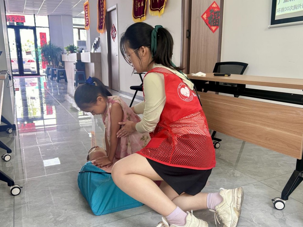 演示結束后,最令人期待的小朋友實踐嘗試環節來了。孩子們躍躍欲試,紛紛舉手想要上臺體驗。在宣傳團成員的耐心指導下,小朋友們輪流上前,按照學到的步驟進行操作。有的小朋友一開始還有些緊張,按壓的力度和位置不太準確,但在宣講成員的手把手糾正和鼓勵下,他們逐漸找到了感覺,操作也越來越規范。家長們在一旁看著孩子認真的模樣,臉上露出了欣慰的笑容,并不時用手機記錄下這有意義的瞬間。