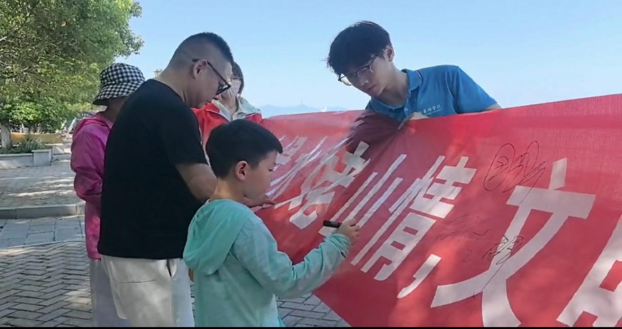 實踐之旅中,一場別開生面的文明旅游宣傳活動成為靚麗風景。橫幅承諾,成員們拉起"青山綠水姥山情,文明旅游共踐行"的橫幅。熱情邀約,積極邀請游客與居民簽名,普及文明出游知識,倡導愛護環境、尊重文化。落筆擔當,游客紛紛響應,鄭重簽名,許下"文明旅游,從我做起"的承諾。實踐團以實際行動,為姥山島旅游發展注入文明新風。