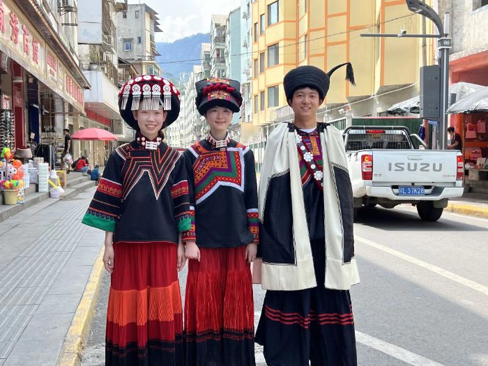 在四川省非遺傳承人阿赫秀枝老師的悉心指導(dǎo)下,實(shí)踐隊(duì)員們沉浸式體驗(yàn)了彝族刺繡技藝與服飾文化。團(tuán)隊(duì)成員李佳佳、黃云馨、魏鵬等同學(xué)親身試穿了融合多元文化元素的小涼山特色彝族服飾——不同的彝繡服飾承載著各異的寓意與深情,既凝結(jié)著彝家人對(duì)子女的呵護(hù),也飽含著他們對(duì)美好生活的殷殷期盼……