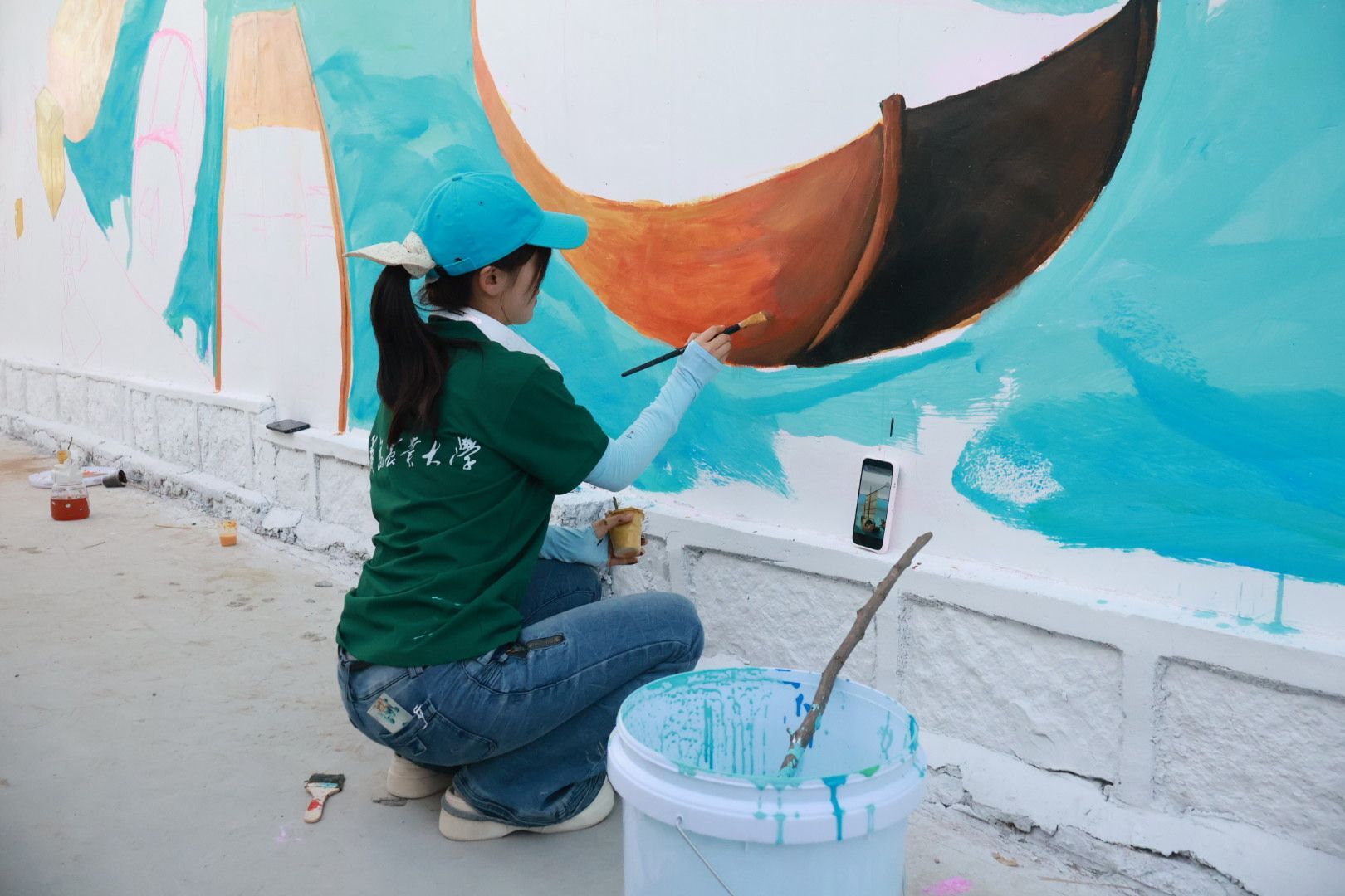 圖為隊員們進行墻繪填色工作。王齊瑋 供圖
