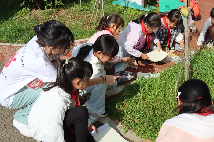 《生命的影子》課上,團隊成員倪立涵用簡單的實驗演示,清晰講解光沿直線傳播及影子的產生的原理。“畫影子”活動,引導孩子們將校園中各種動植物的影子記錄在畫紙上,孩子們都覺得饒有趣味。課程結尾,倪立涵小結道:“對影子的接納與對話,本質上是一場關于勇氣的生命儀式。”這堂課,讓孩子們在童真中觸摸成長的深意,體悟光影里的成長哲思。