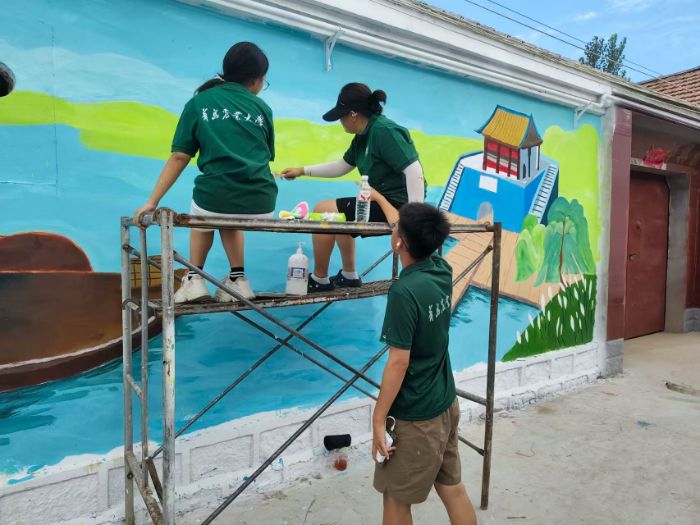 實踐團首先扎根實地調研,深度挖掘四女寺鎮特有的“四女奉親 孝德文化與運河文化底蘊。在此基礎上,團隊成員化身“文化畫師”,將傳統元素融入鄉村風貌設計,通過細膩筆觸再現“四女奉親”的孝德典故,以濃墨重彩描繪運河往昔商船往來的繁華盛景。在短短十天內,隊員們高效完成了一系列精美墻繪作品,讓沉睡的歷史故事“躍”上墻面,將無形的文化遺產轉化為鄉村公共空間中可觸可感的文化景觀。