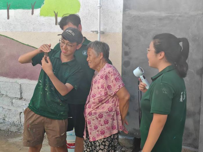 活動過程中,團隊與當地黨員、村民深度聯動:走進黨員王合平家中聆聽歷史回響,與村鎮書記共同商議墻繪方案,向村民征求創作意見……從粉筆起稿、調色暈染到細節打磨,每一筆都凝聚著校地協作的心血。值得一提的是,隊員們還向村民展示了墻繪AR技術,讓靜態畫作與數字科技碰撞出奇妙火花,為傳統文化傳播注入現代活力。