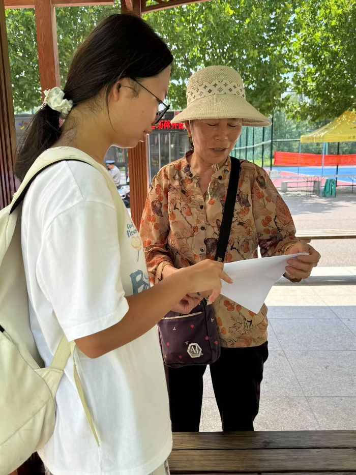 活動伊始,成員們手持調查問卷,禮貌地向公園內休閑健身的市民進行訪談和調研。問卷內容涵蓋市民對周邊生態環境的滿意度、環保行為習慣以及對生態文明建設的意見與建議等方面。通過面對面交流,實踐團不僅收集了寶貴的一手數據,用于后續研究分析,更廣泛傳播了“綠水青山就是金山銀山”的生態理念。而公園的中心廣場也有隊員在向公園里的人宣傳美麗中國建設理念,讓更多人投入到建設美麗中國。