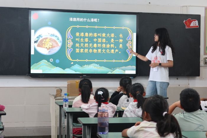 “同學們,咱們先玩個‘八倍鏡看春晚’的游戲!”課堂剛開場,團隊成員就用趣味互動勾起孩子們的好奇心,帶著孩子們穿梭在扇子的文化長河里,從岳州扇暈染的山水詩意,講到榮昌折扇精巧的工藝,當話題落在蘇州本地的蘇州扇時,特意放慢語速讓孩子們感受蘇州扇子細膩與典雅,讓其體會扇面上的每一筆、扇骨的每一道紋理,都藏著姑蘇城千年的韻味。孩子們聽得眼睛發亮,望著手中的扇子,仿佛這不再是簡單的納涼工具,而是能觸摸到千年姑蘇文化的時光寶盒。從東漢時作為帝王儀仗的莊重,到慢慢融入民間成為文化符號,蘇州漆扇在歲月里沉淀的精致,更是讓孩子們聽得入神。