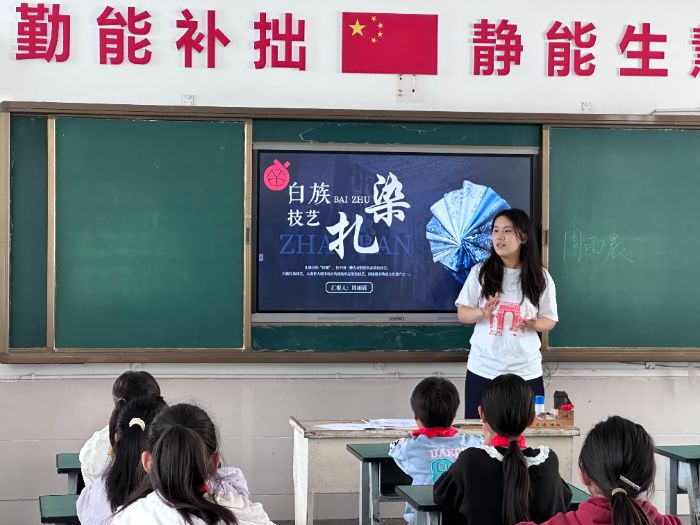 扎染課堂,同樣驚喜滿滿!作為云南代表性非遺,團隊成員從歷史淵源講起,孩子們知道了扎染古稱“絞纈”,是云南白族代代相傳的寶貝技藝,承載著當地山水、民俗與生活智慧,是云南民族文化的鮮活名片。團隊成員一步步為孩子們講解扎染的工藝流程:折布時要像折白族姑娘的頭巾一樣仔細,捆扎得有力才能留住色彩,染色得盯著那抹藍慢慢沁入布料……這些帶著云南水土氣息的步驟,看似簡單,實則超考驗耐心。孩子們迫不及待動手,折布、捆扎、染色,每一步都學得格外認真,仿佛手里攥著的不是布料,而是能變出魔法的白族寶物。