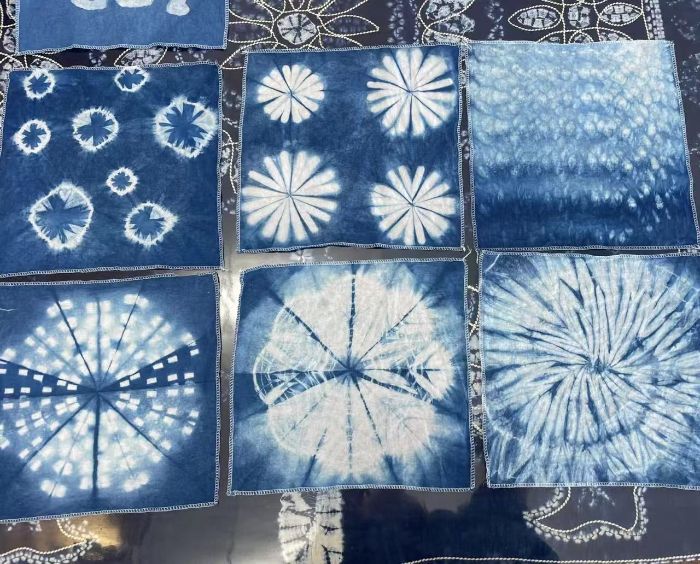 最激動人心的時刻就是拆繩。當孩子們小心翼翼拆開線繩,藍白相間的圖案“蹦” 出來的瞬間,歡呼聲此起彼伏:有的圖案像夏夜的星空,星星點點錯落;有的像山間綻放的野花,靈動又俏皮。每一塊布料都成了“孤品藝術”,就像白族同胞走在山間地頭,隨手就能擷取自然靈感,把云南的山水靈氣,都染進了這一方布料里,帶著濃郁的云南當地文化印記,怎么看都看不夠!