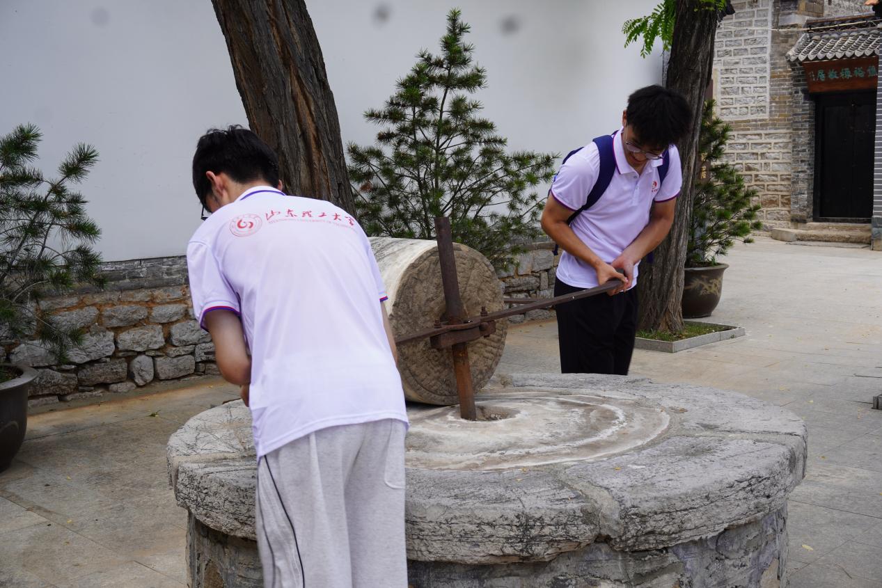 抵達焦裕祿故居后,實踐團成員首先來到焦家油坊門前,對石磨盤進行了體驗。在講解員的指導下,同學們親手轉動石磨盤,感受著其中蘊含的勞動艱辛與生活智慧。