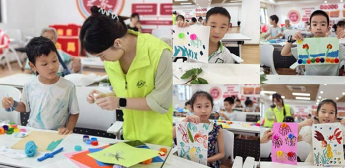 在實踐環節,江北新區社區的孩子們搭建簡易凈水裝置,看著污水澄清,物理過濾的原理清晰可感;在外港社區,藝術與科學交融——孩子們用樹葉、瓶蓋在宣紙上作畫,繪制綠色家園。一旁的水循環模型則模擬水從使用到凈化的全程。他們即看見了水的旅程,又在創作中理解了人與水共生共美。