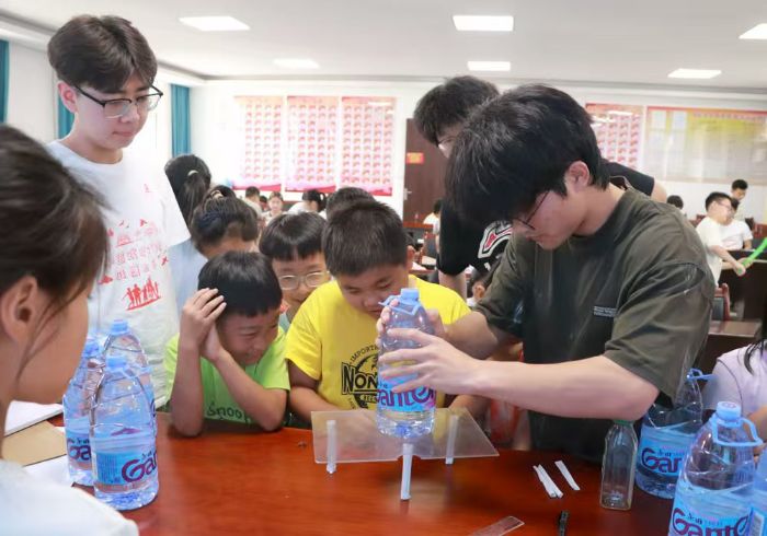 微光小隊(duì)帶領(lǐng)小朋友們發(fā)揮創(chuàng)意與協(xié)作,利用回收的飲料瓶精心制作箭體,安裝穩(wěn)定尾翼,并精確調(diào)試水量。發(fā)射場(chǎng)上比拼氣氛熱烈。隨著“加壓…發(fā)射!”的口令,“嘭”的一聲,道道水柱激射,一枚枚由廢棄塑料瓶改造的水火箭在反沖力推動(dòng)下直沖藍(lán)天,劃出優(yōu)美軌跡。每一次成功的發(fā)射,都伴隨著各組隊(duì)員的雀躍與掌聲。